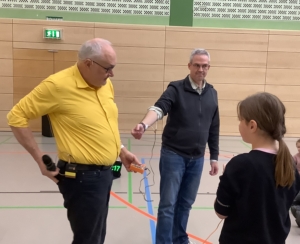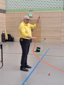 Für das nächste Experiment tauchte Hecker einen langen Schnürsenkel in Wasser und berührte ihn mit dem Messgerät. Je nachdem, an welcher Stelle er den Schnürsenkel anfasste, änderte sich der Ton. So spielte Hecker sehr zur Freude der Kinder „Alle meine Entchen“.