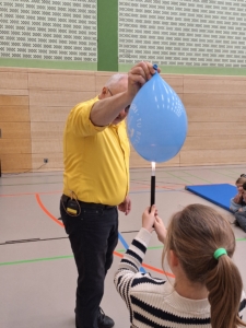 Ein Luftballon über einem Feuerzeug platzt. Das ist logisch. Doch wenn er mit Wasser gefüllt ist, passiert nichts! Denn das Wasser nimmt die Hitze auf. Die Kinder konnten die Erklärung selbst geben: „Wasser kühlt“