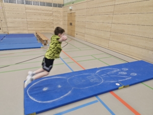 - Sprünge von einem hohen Kasten, mit dem Ziel, auf einer Bodenmatte zu landen, auf der ein Hase aufgemalt war – je weiter das Kind sprang, desto besser („Wer schafft es bis zu den Ohren?“)