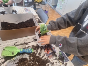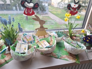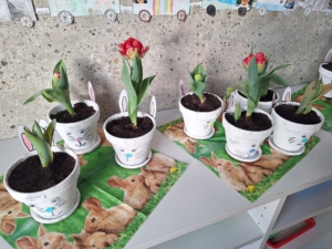 Die Kinder pflanzten verschiedene Frühlingsblumen und gestalteten die dazugehörigen Blumentöpfe. Diese wurden österlich verziert, unter anderem mit Hasenohren und Hasengesichtern, sodass kleine, dekorative Frühlingsgefäße entstanden.