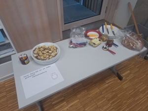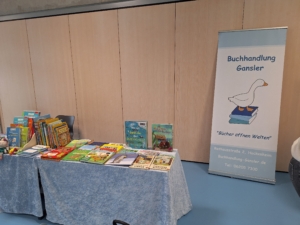 Begleitend zur Präsentation gab es mehrere zusätzliche Aktionen. Ein Büchertisch der Buchhandlung Gansler bot eine Auswahl an Kinderbüchern an, darunter auch Titel passend zu den Themen der Projektwoche.