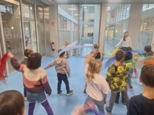 Ein weiterer Bestandteil der Projektwoche war das Einüben eines Frühlingstanzes. Mit bunten Tüchern probten die Kinder verschiedene Bewegungen und stellten diese später vor.