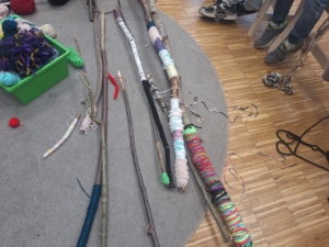 Auch dekorative Elemente wurden hergestellt. Äste wurden mit bunten Wollfäden umwickelt und als Dekostöcke in den Beeten platziert. Holzkochlöffel wurden bemalt und als Figuren wie Bienen oder Marienkäfer gestaltet.