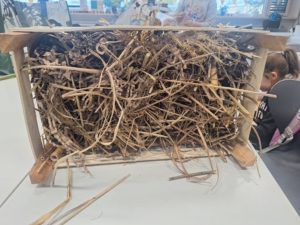 Im Rahmen der Gartengestaltung entstand auch ein Insektenhotel. Dazu wurde eine Kiste mit verschiedenen Naturmaterialien gefüllt, um Insekten geeignete Nistmöglichkeiten zu bieten.