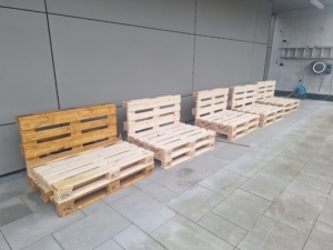 Parallel dazu entstanden aus Europaletten Sitzmöbel für die Terrasse. Diese Arbeit erforderte mehrere Schritte: Zunächst mussten die Paletten abgeschliffen und anschließend geölt werden. Diese Tätigkeiten verlangten Ausdauer und Sorgfalt, da das Schleifen körperlich anstrengend war. Einige Paletten müssen noch fertig geölt werden. Der endgültige Zusammenbau erfolgte durch die Hausmeister. Für die Sitzgelegenheiten sollen noch Sitzkissen angeschafft werden.