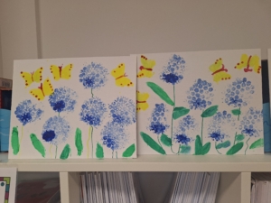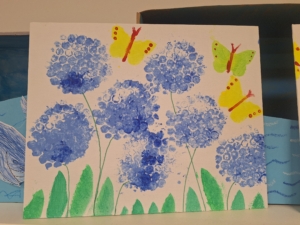 Mit Hilfe von Luftpolsterfolie entstanden ausdrucksstarke Bilder mit Frühlingsmotiven, auf denen Schmetterlinge und Blumenlandschaften zu sehen waren.