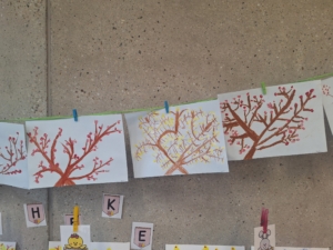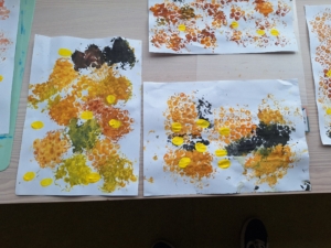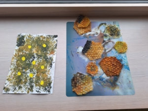 In der Klasse 1c entstanden thematisch passende Bilder. Dabei nutzten die Kinder Luftpolsterfolie, um Wabenstrukturen auf ihre Kunstwerke zu stempeln.