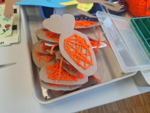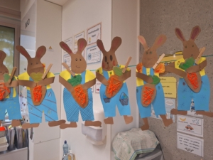 Die Kinder stellten Hasenfiguren her, die mit selbstgestickten Karotten ausgestattet wurden.