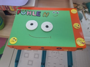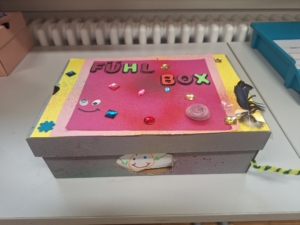 Im Bereich Fühlen stellten die Kinder eigene Fühlboxen aus Schuhkartons her. Diese wurden zunächst gestaltet und anschließend mit unterschiedlichen Materialien befüllt.