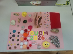 Zusätzlich entstand ein sogenannter „Fühlteppich“: Auf einem großen Plakat wurden verschiedene Materialien zu einer tastbaren Fläche zusammengestellt.