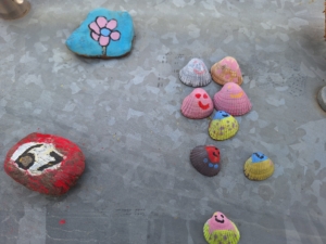 Die Schülerinnen und Schüler brachten von zuhause zahlreiche Materialien mit, darunter Steine, Muscheln, Äste, Zweige und Blumenzwiebeln. Die Steine und Muscheln wurden farbig bemalt und dienten später zur Verzierung der Beete.
