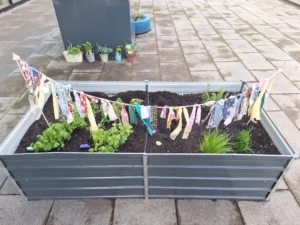 Darüber hinaus entstanden Wimpel aus Stoffresten, die später zur Verzierung eingesetzt werden. Jede Schülerin und jeder Schüler bepflanzte außerdem einen kleinen Blumentopf mit Kressesamen, der mit nach Hause genommen werden konnte.