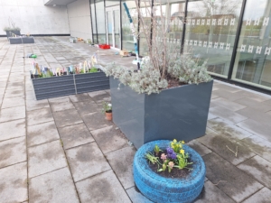 Die Klassen 3b und 3c arbeiteten an einem umfangreichen Projekt zur Gestaltung der Außenterrasse der Hartmann-Baumann-Schule. Dabei wurde der Bereich begrünt und als Ort zum Verweilen für die Schülerinnen und Schüler gestaltet.
