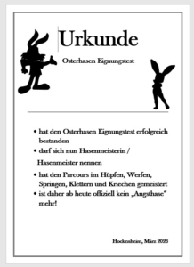 Unter dem Motto „Angsthasenprüfung“ konnten die Kinder verschiedene Stationen durchlaufen, bei denen Geschicklichkeit, Koordination und Mut gefordert waren.